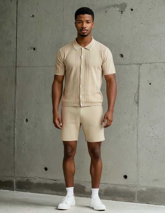 Hexagon Reverie Long Sleeve Knitted Polo Shirt in Beige