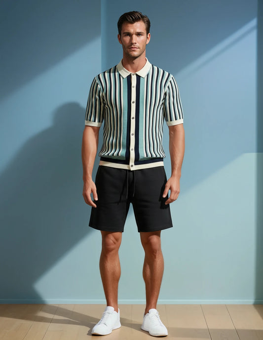 Tide Stripe Knit Button Up Summer Shirt In Blue
